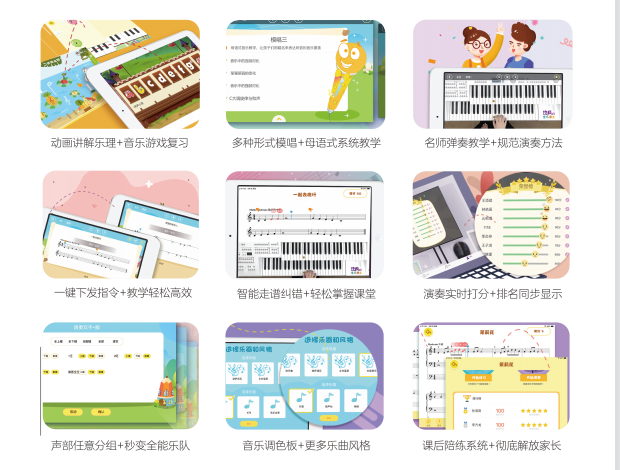 玖月教育旗下產品-玖月智能音樂課堂,以雙排鍵為載體,針對3-7歲兒童進行音樂啟蒙教學。樂理動畫、打分排行、全能樂隊、課后陪練等模塊,融合互聯網、動畫、音樂、游戲等形式,為孩子搭建一個易學有趣、智能創新的學習平臺;其標準化智能課件,降低了教師門檻,解決了機構師資難以復制的問題;小組課的教學形式,營造濃厚的學習氛圍,增強互動性。多種興趣激發及智能教學模式,讓孩子快樂學琴、練不釋手,是國內智能音樂教育體系的產品。